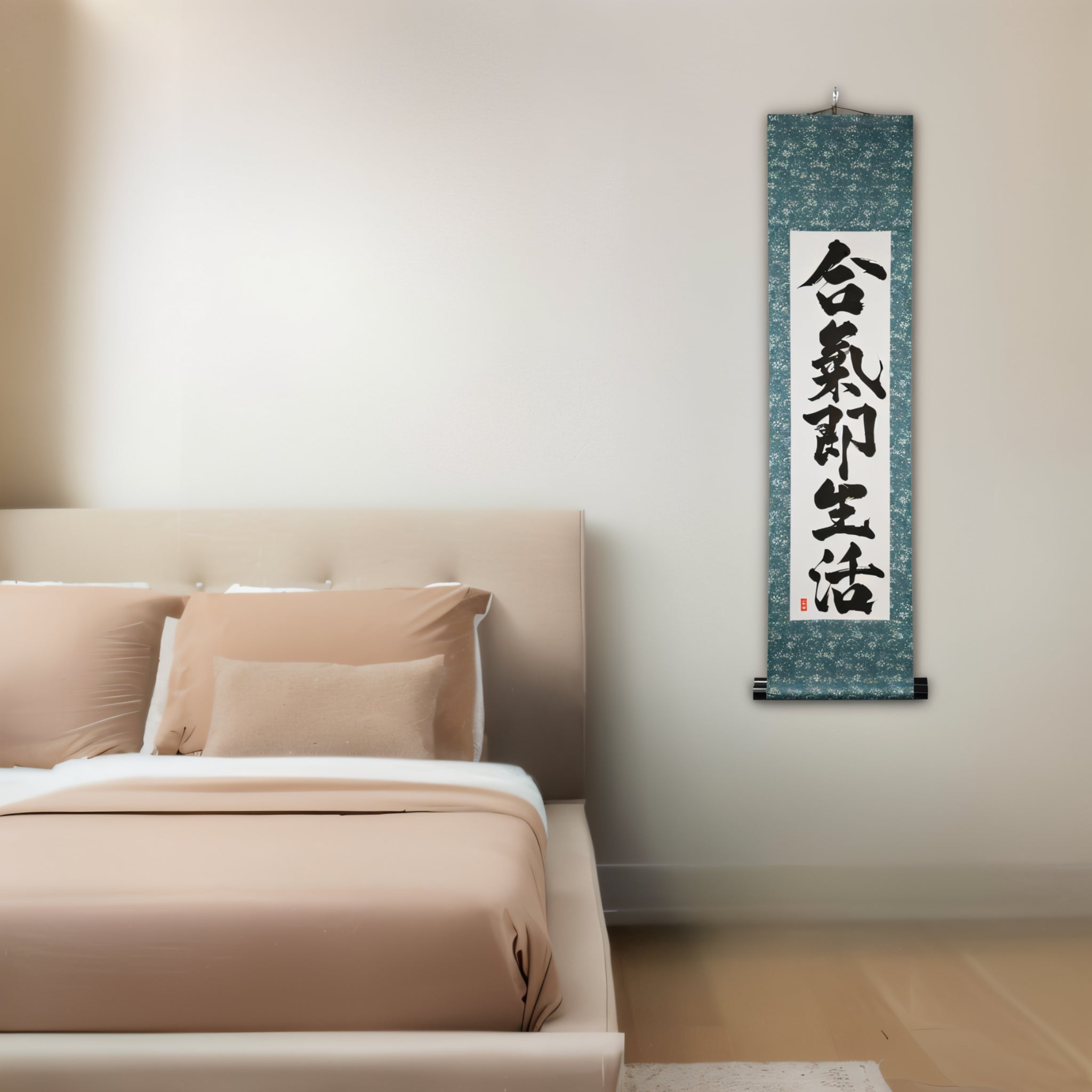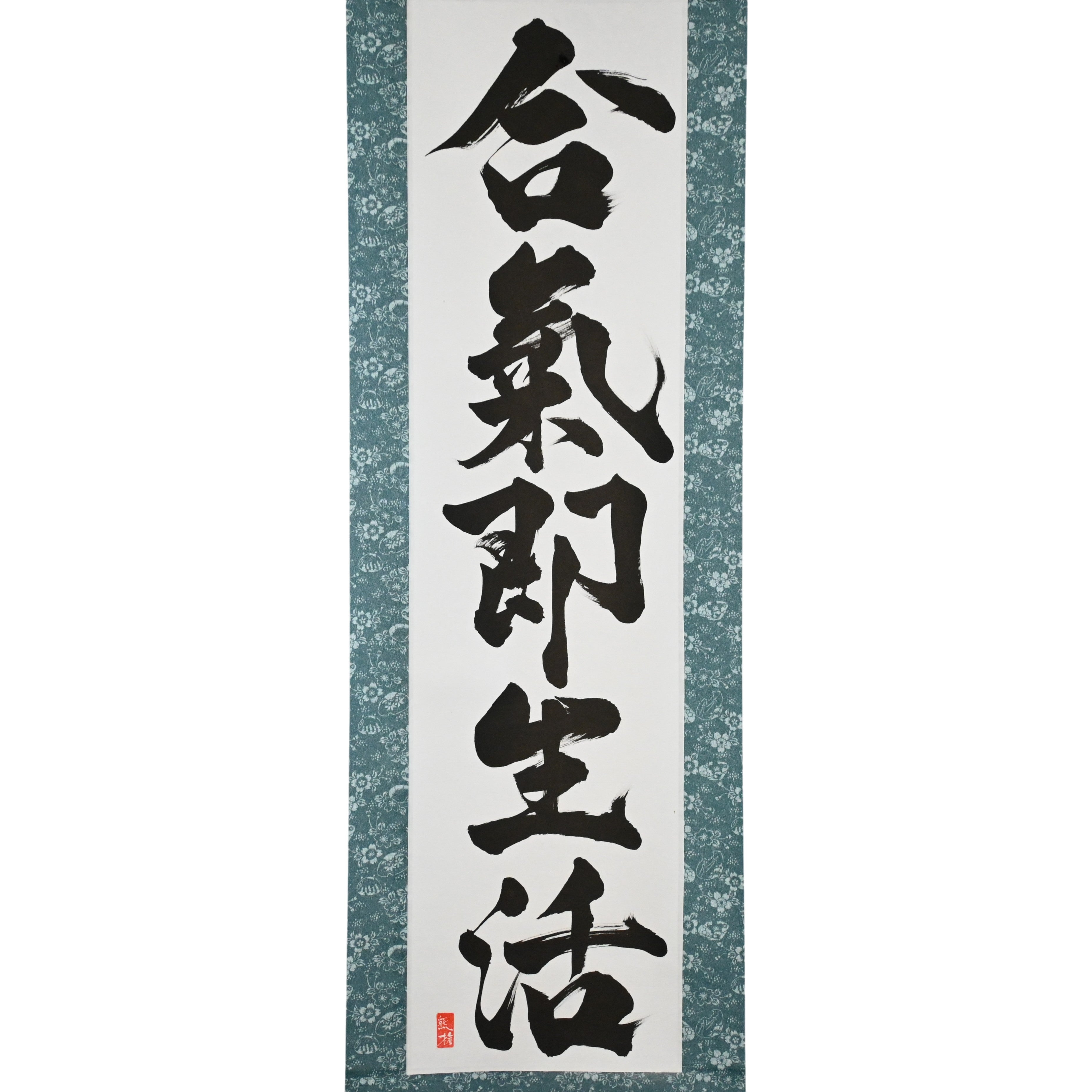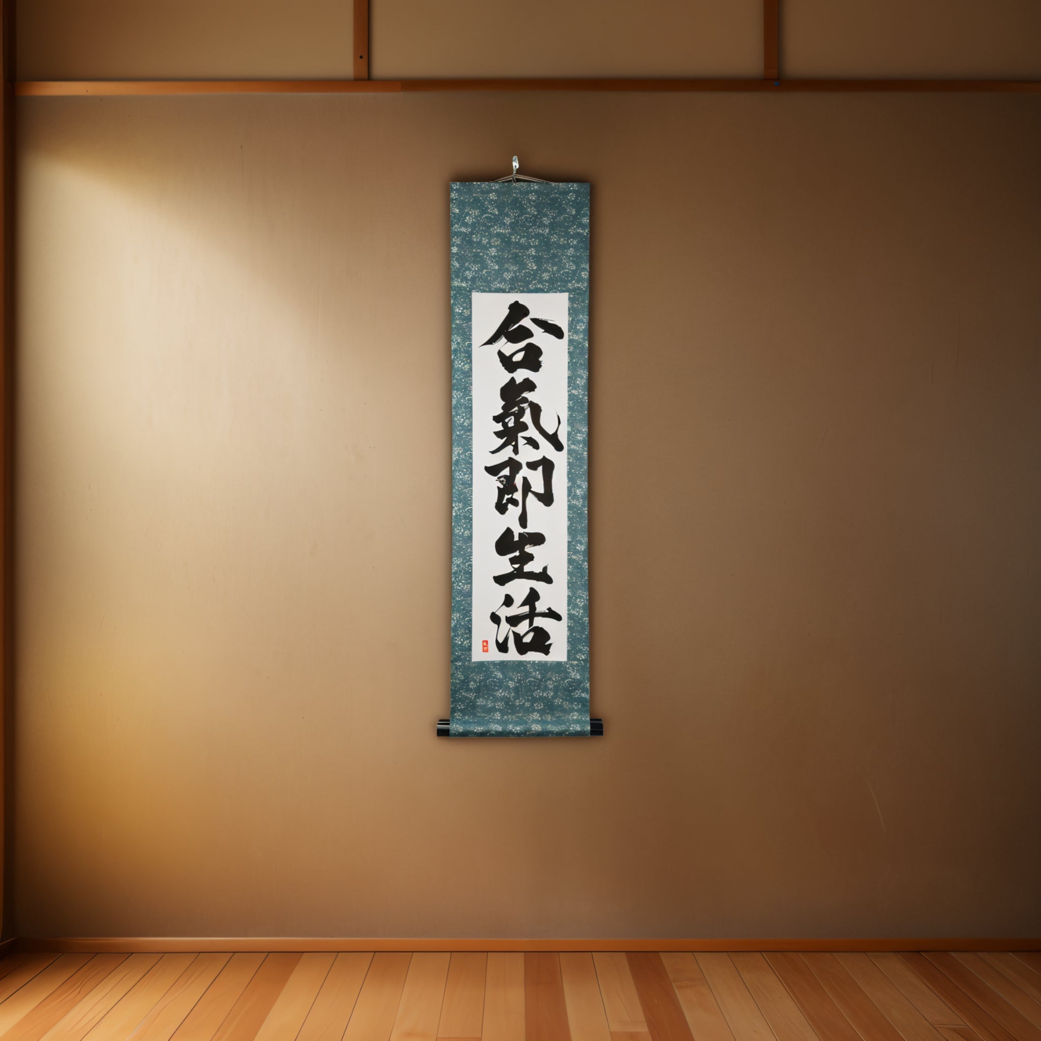 Este pergamino de caligrafía japonesa presenta la profunda frase 合気即生活 (Aiki Soku Seikatsu) — "El Aikido es la vida diaria". Expresa un principio fundamental del Aikido: el arte no se limita al dojo, sino que fluye en cada momento de nuestras vidas.