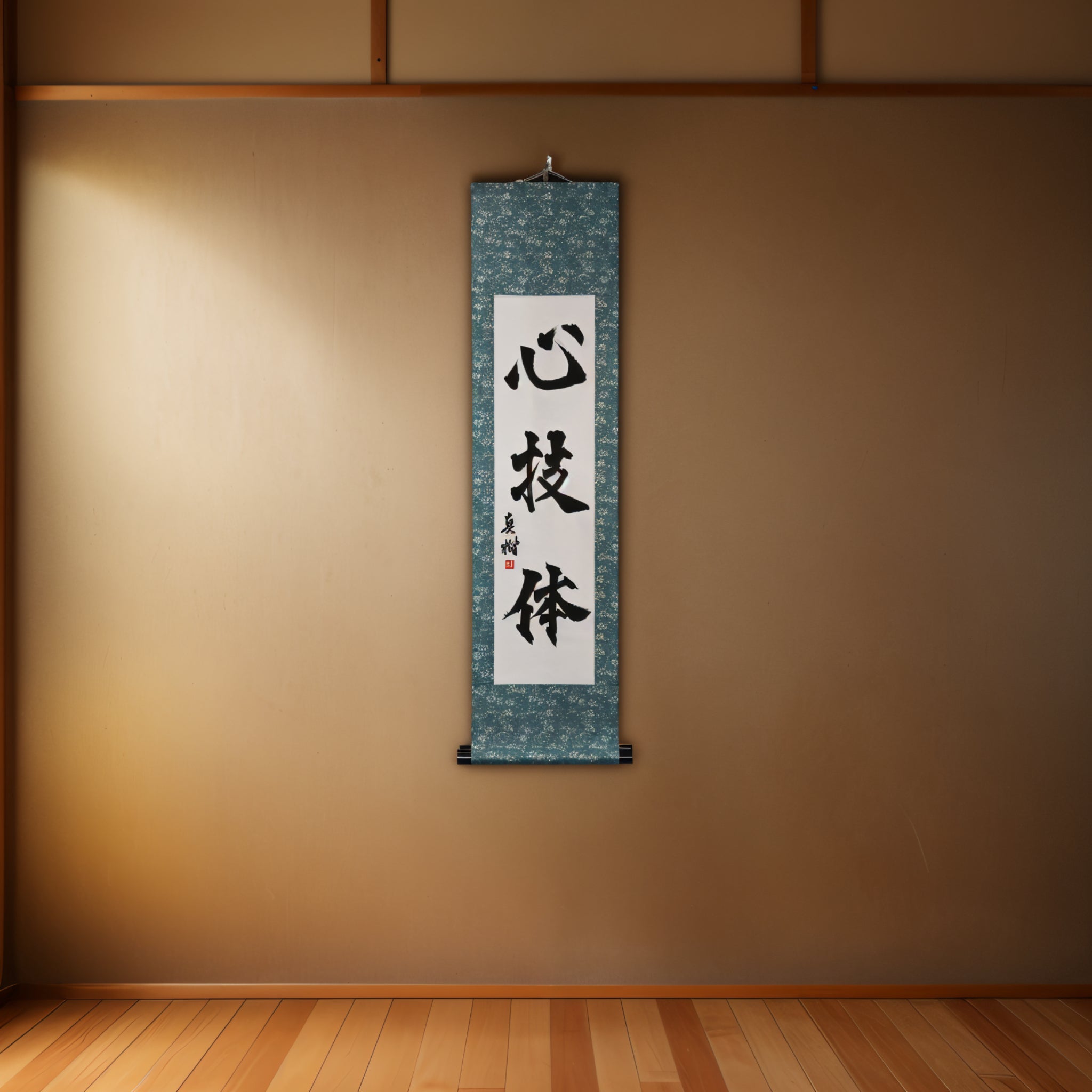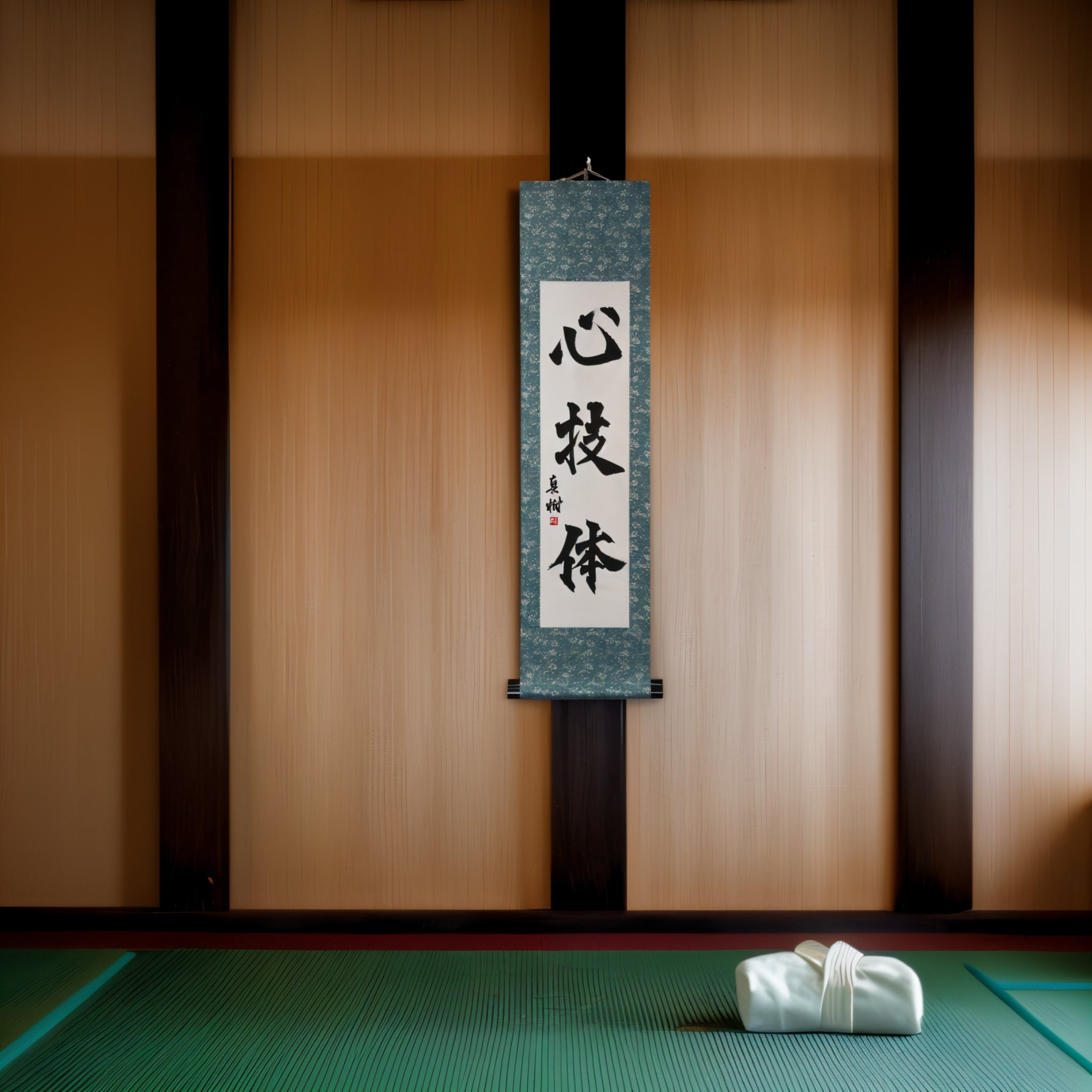 Este pergamino de caligrafía japonesa presenta la frase venerada 心技体 (Shingitai) — el concepto fundamental detrás de todas las artes marciales tradicionales japonesas, incluyendo Judo, Karate, Aikido y más.