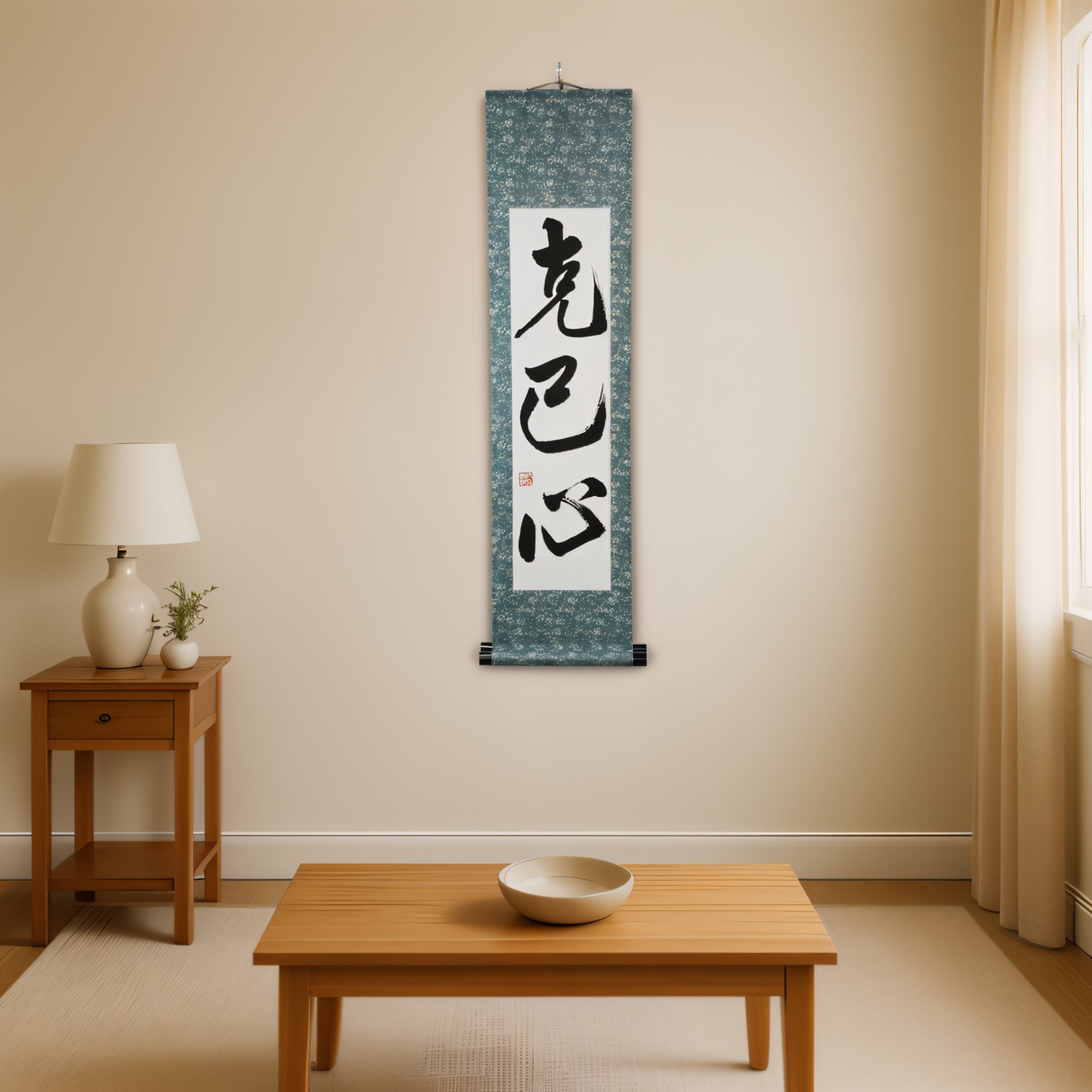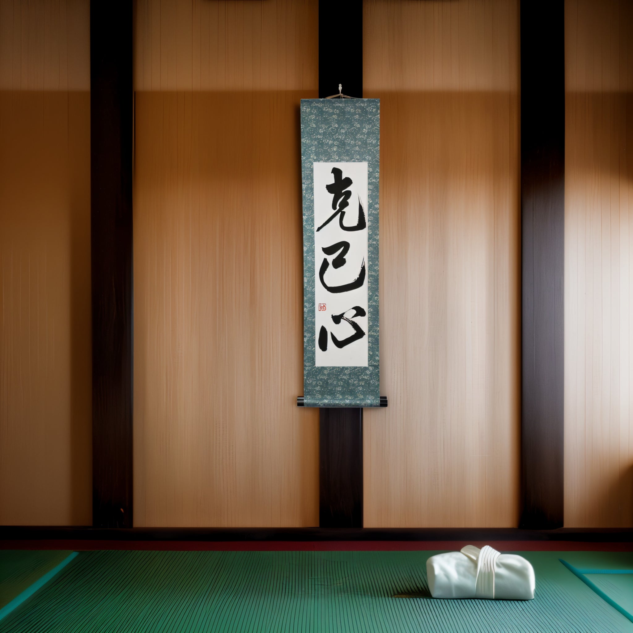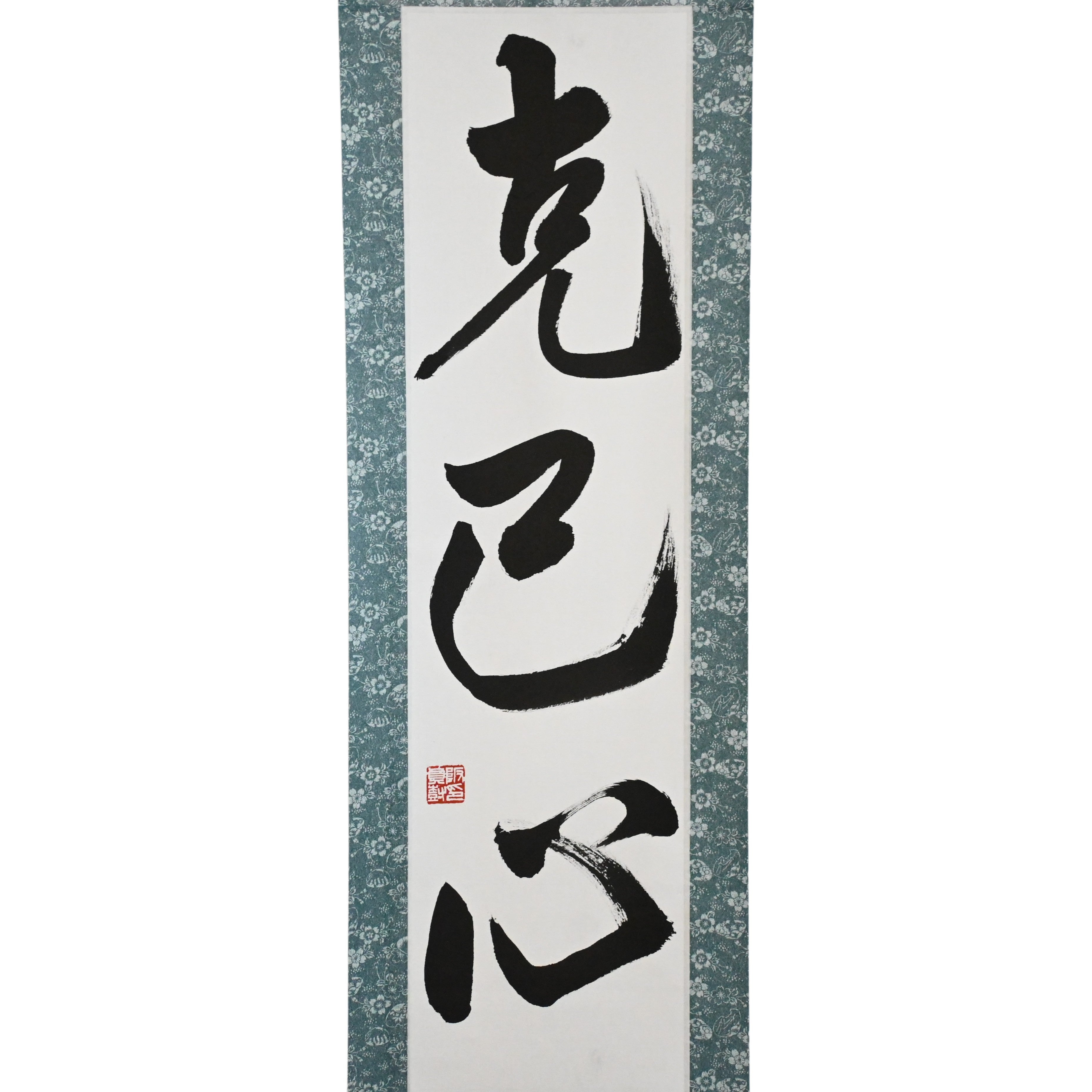 Este pergamino de caligrafía japonesa presenta el poderoso término 克己心 (Kokkishin), que significa "el espíritu del dominio propio". Representa un principio universal en Karate, Judo y Aikido: la idea de que el mayor oponente suele estar dentro de uno mismo.