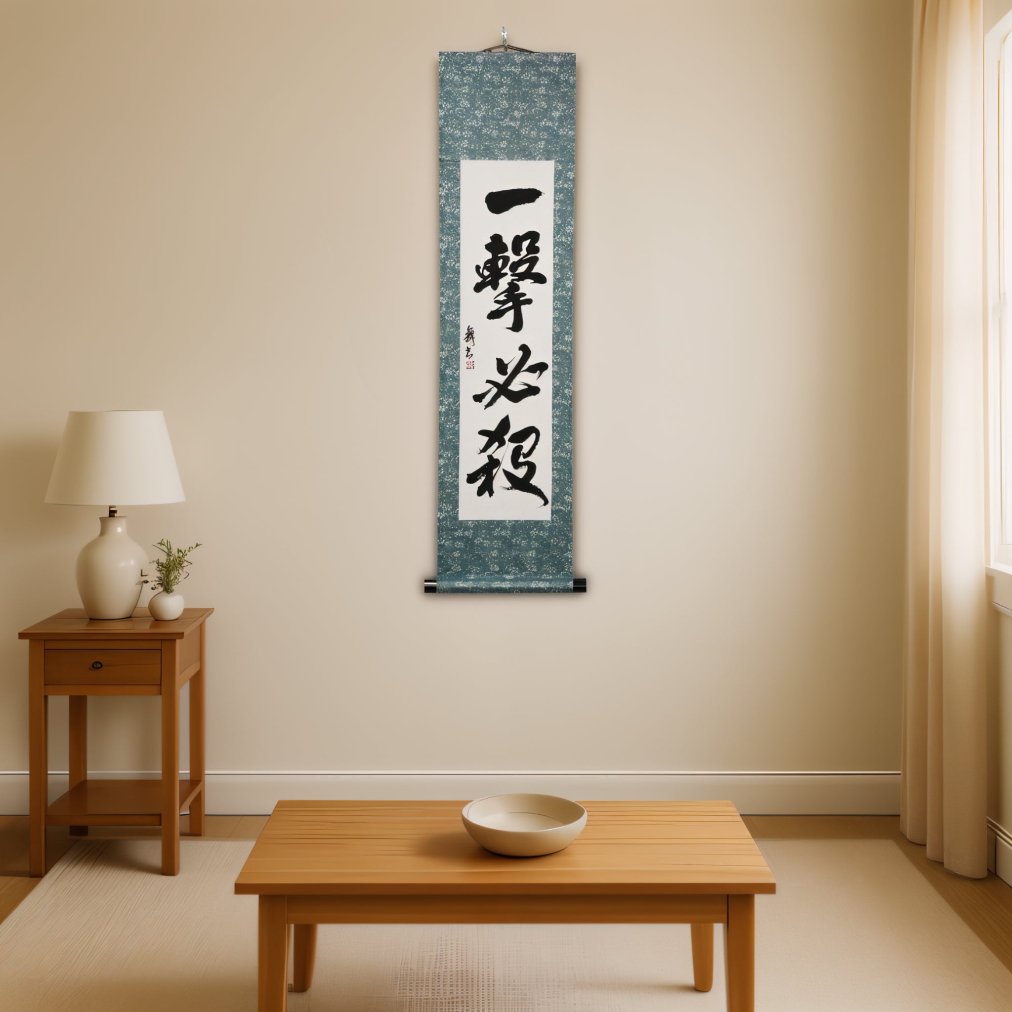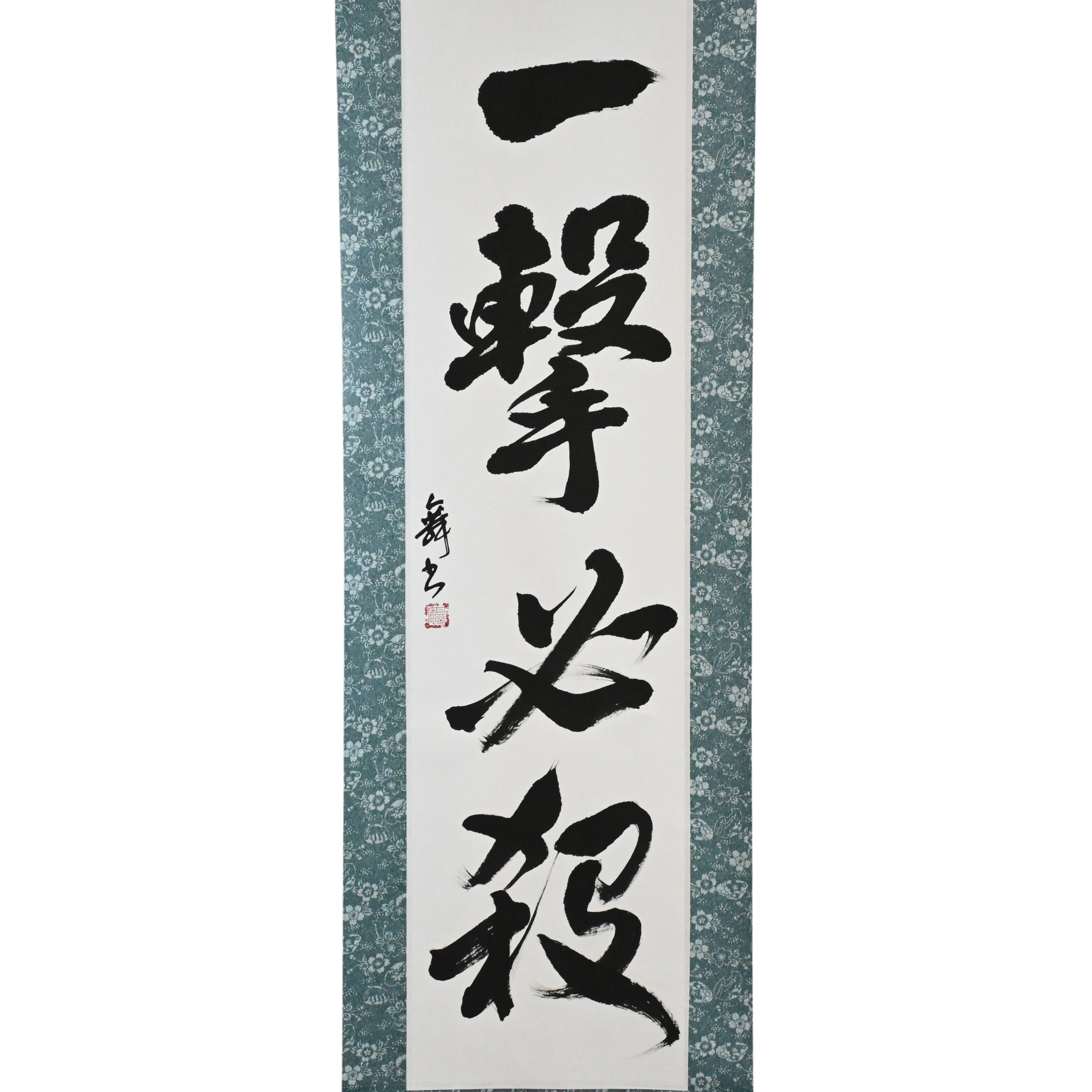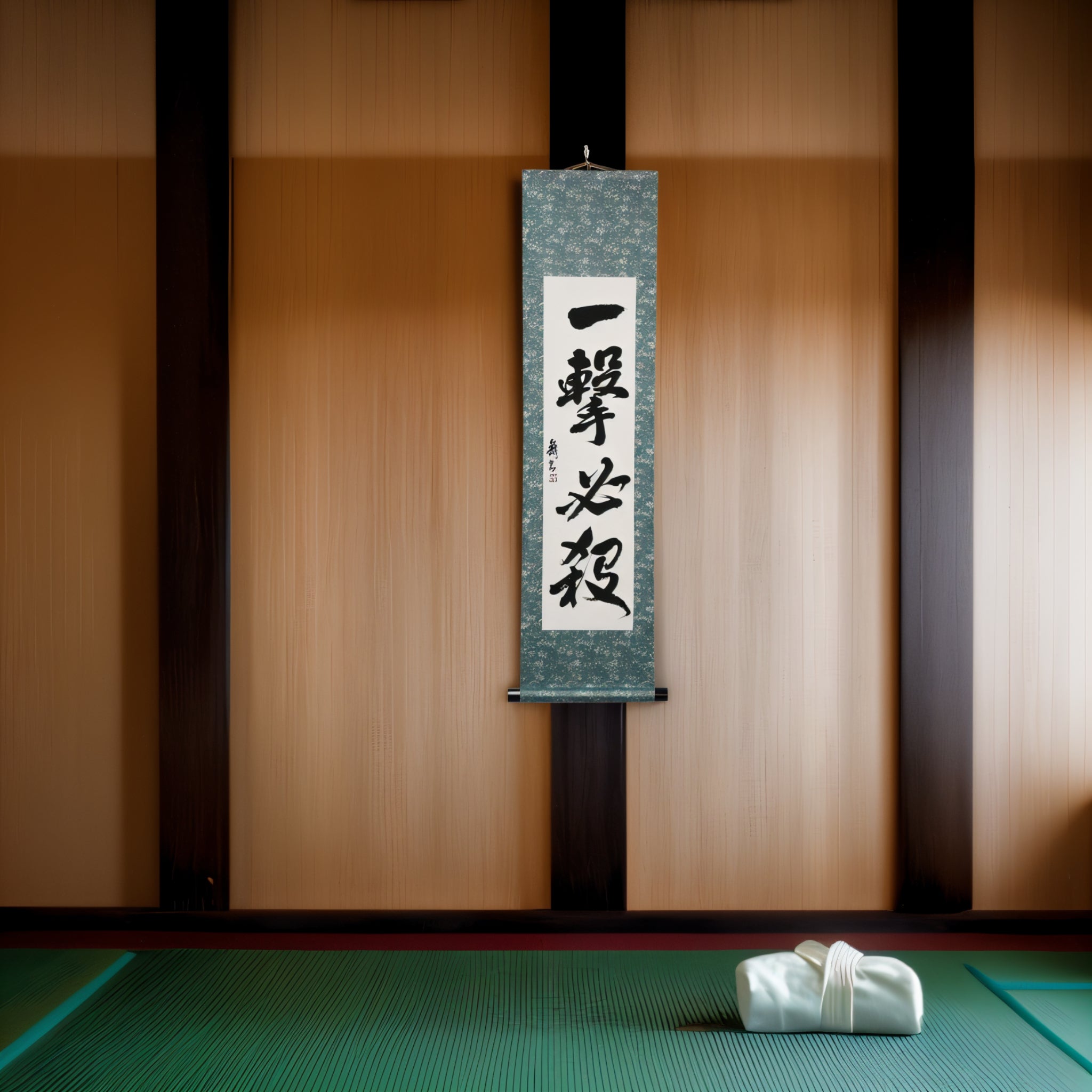 Encarnando la filosofía central del Karate, este llamativo pergamino de caligrafía japonesa presenta la frase 一撃必殺 (Ichigeki Hissatsu) — que significa “Un Golpe, Muerte Segura”. Refleja el ideal de ejecutar una técnica única, precisa y decisiva que termina el conflicto al instante.