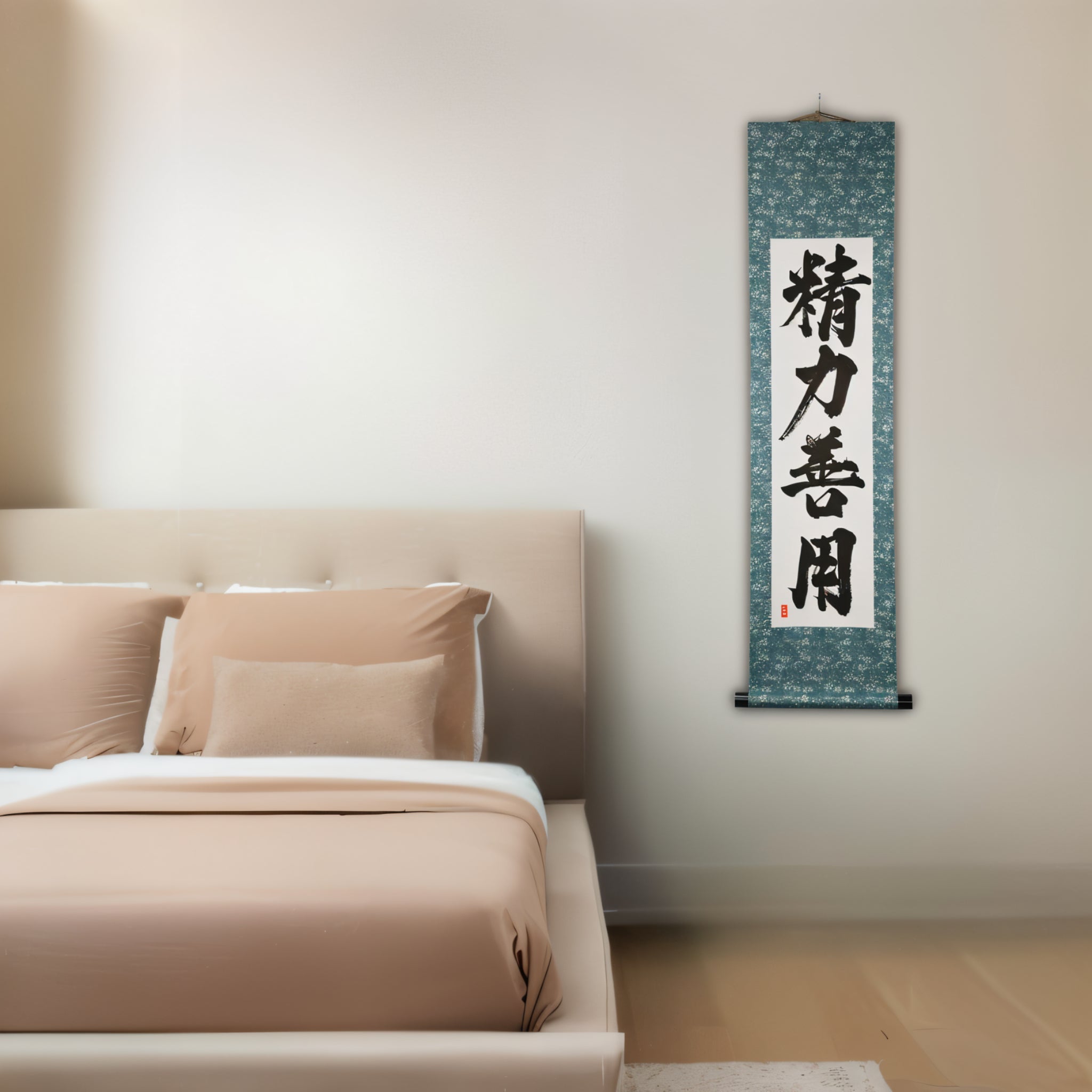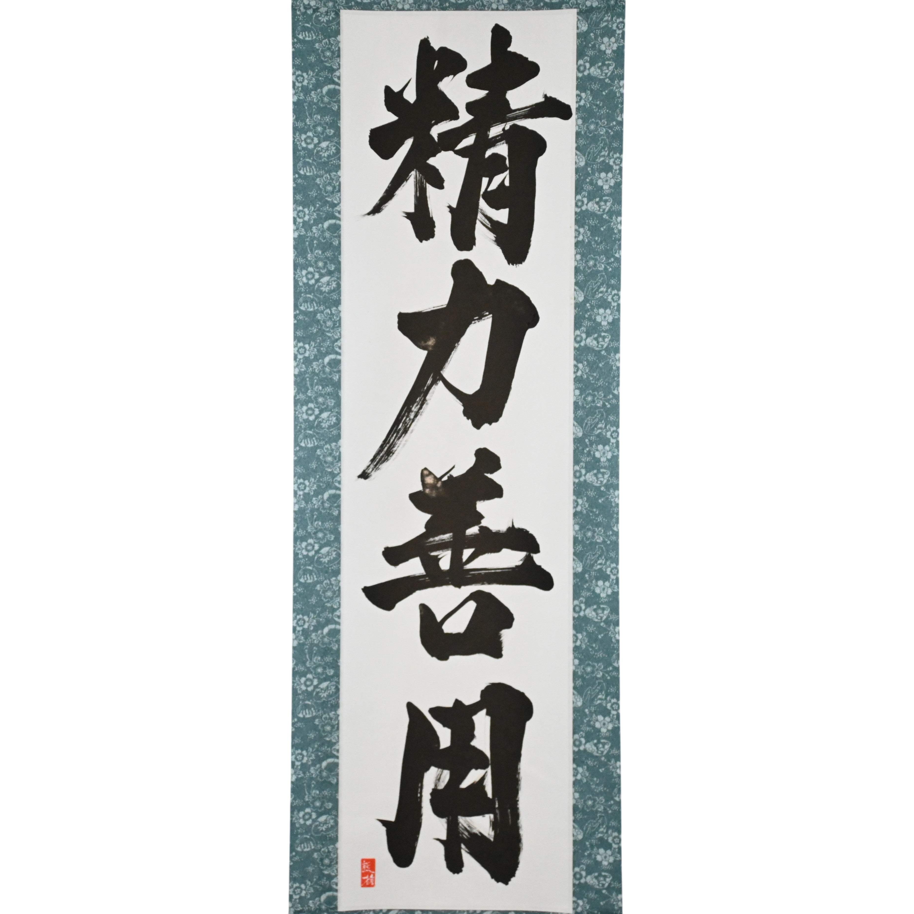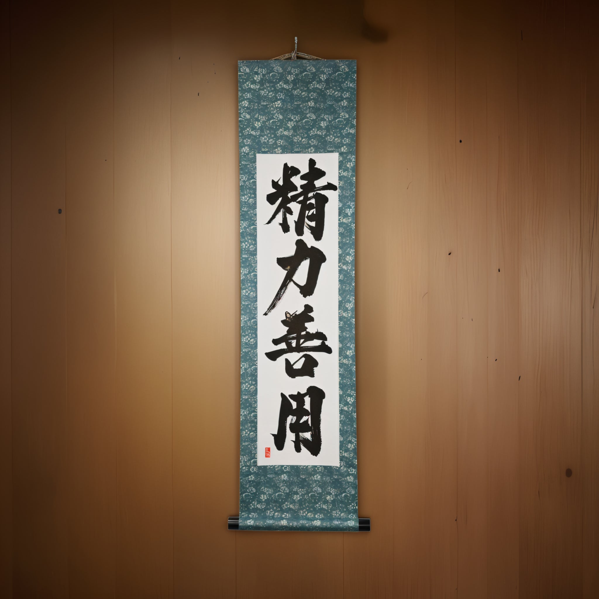 Este pergamino de caligrafía japonesa presenta la frase atemporal 精力善用 (Seiryoku-Zenyō) — traducida como "Uso Máximo y Eficiente de la Energía". Es uno de los dos principios fundamentales del Judo, junto con 自他共栄 (Jita-Kyōei, "Bienestar y Beneficio Mutuo"), ambos establecidos por el fundador del Judo, Jigoro Kano (嘉納治五郎).
